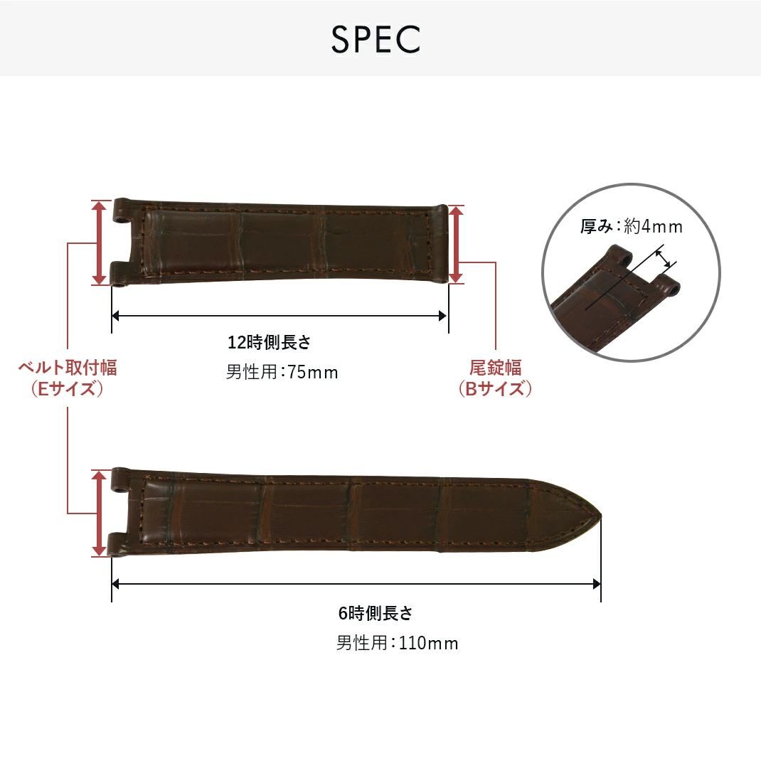 ※『時計ベルト取り付け幅(Eサイズ)』及び 『尾錠取り付け幅(Bサイズ)』につきましては、表示のサイズから約0.3mm~0.8mm程度広く作られています。取り付けられなかった際は無料でお取替えさせていただきますのでご安心ください。